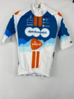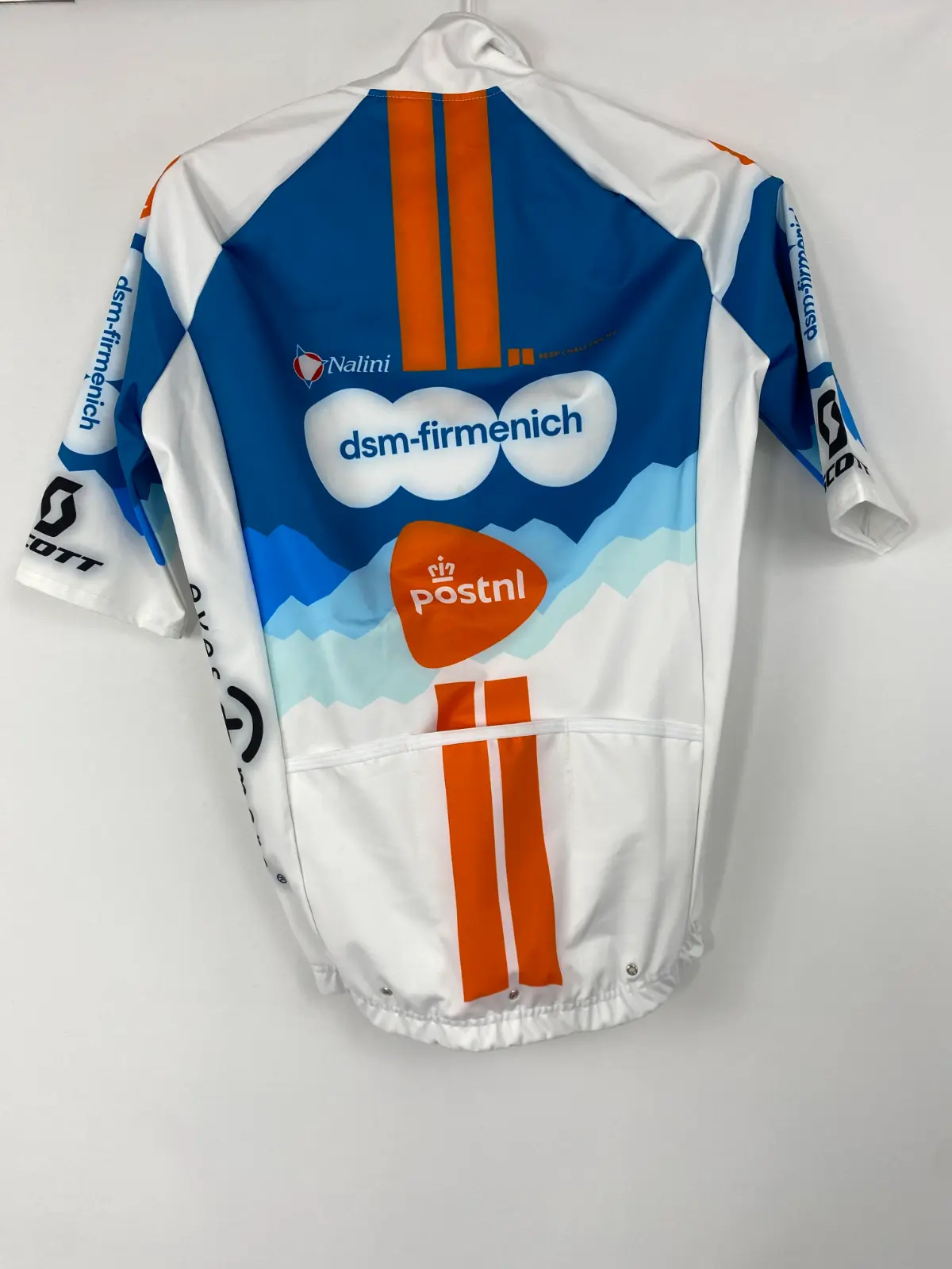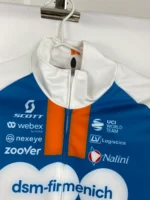 Usada por los ciclistas profesionales del equipo DSM, esta chaqueta de corte ceñido combina tejidos técnicos que mantienen el cuerpo seco y regulan la temperatura durante esfuerzos intensos. Su diseño de manga corta permite combinarla fácilmente con manguitos, aumentando su versatilidad sin perder eficiencia.
