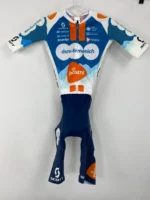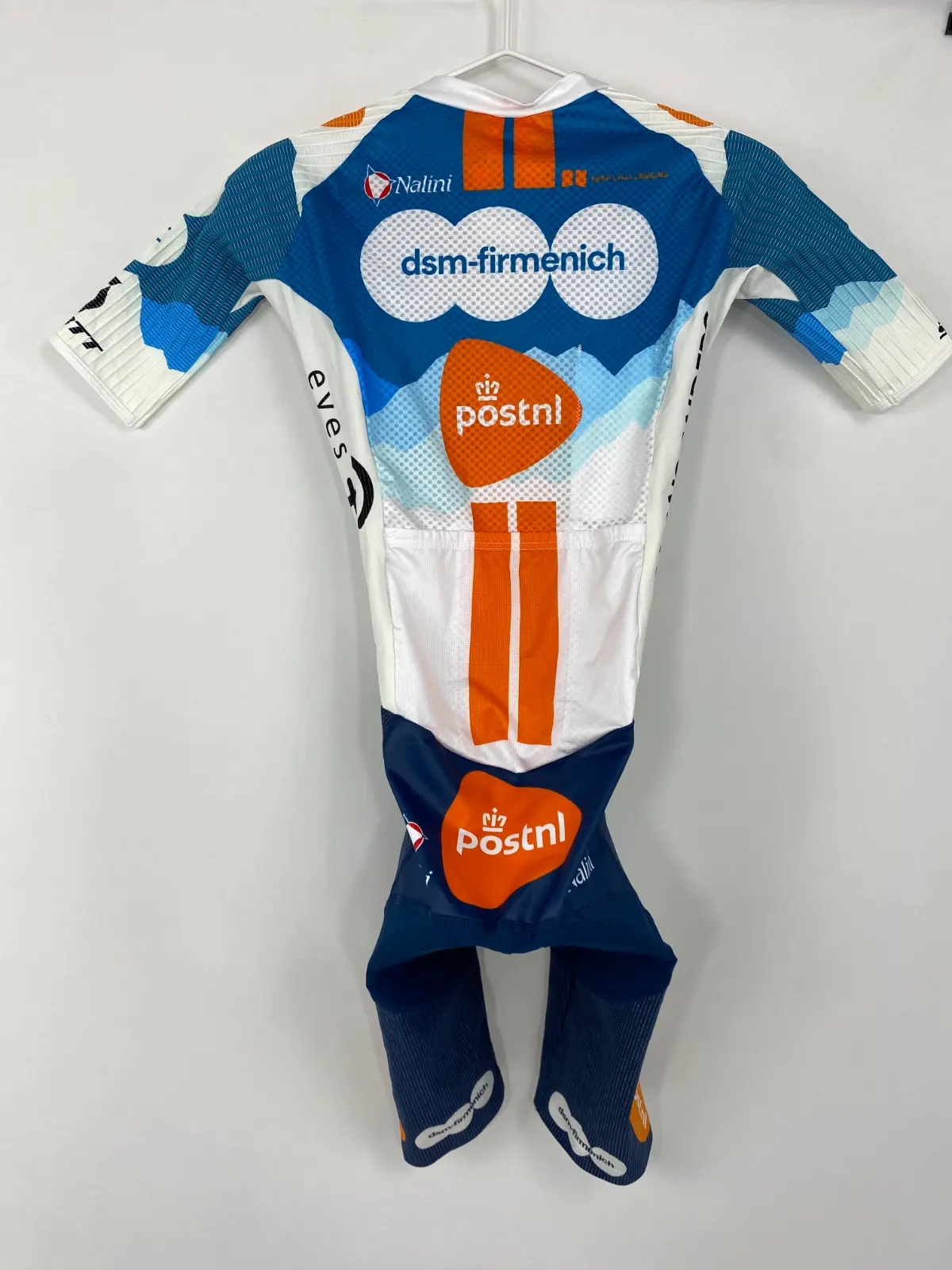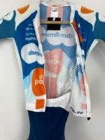 A pesar de su alto nivel de protección, el mono mantiene una construcción ligera y transpirable gracias a su estructura tipo rejilla, ideal para climas cálidos. Su ajuste ceñido garantiza comodidad, libertad de movimiento y aerodinámica en todo momento, mientras que su diseño refleja la identidad visual del equipo DSM.