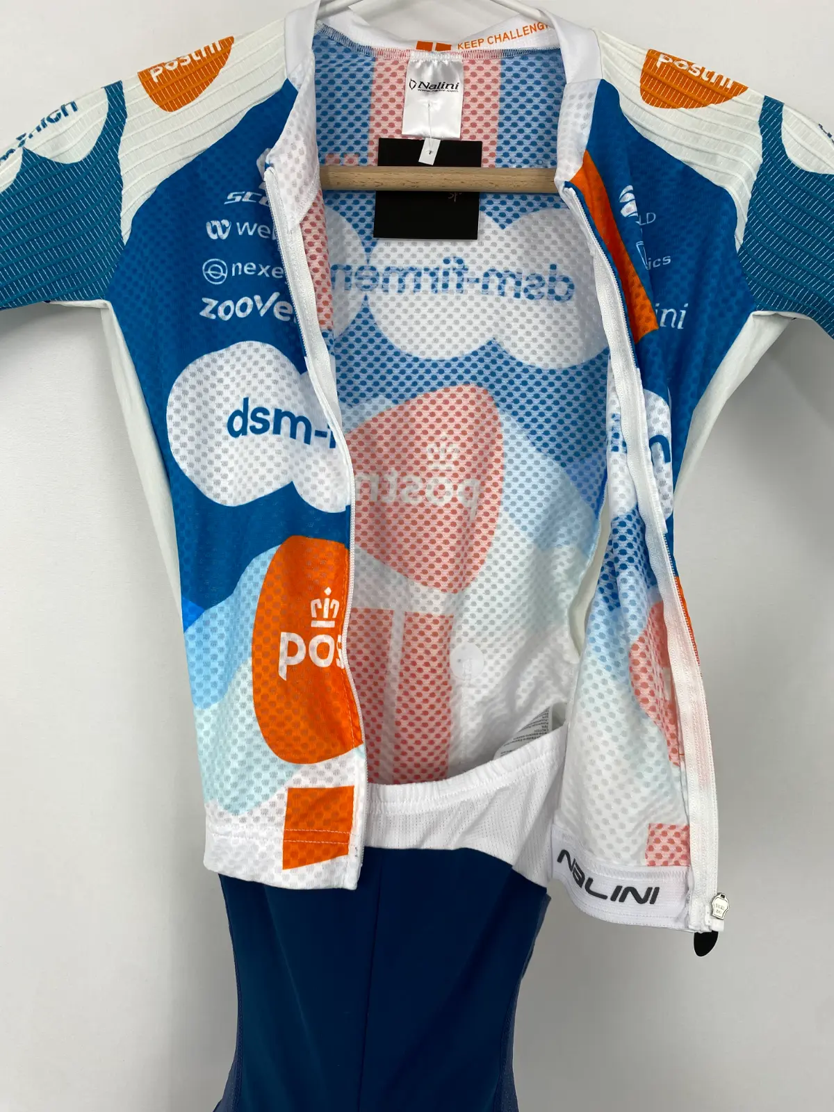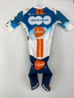 El mono de rejilla con Dyneema del Team DSM ha sido desarrollado para ofrecer la máxima protección sin comprometer el rendimiento aerodinámico. Usado por los ciclistas del equipo DSM en etapas donde las caídas son una posibilidad real, este mono incorpora tejido Dyneema, una de las fibras más resistentes del mundo, en zonas estratégicas para minimizar abrasiones en caso de impacto.
