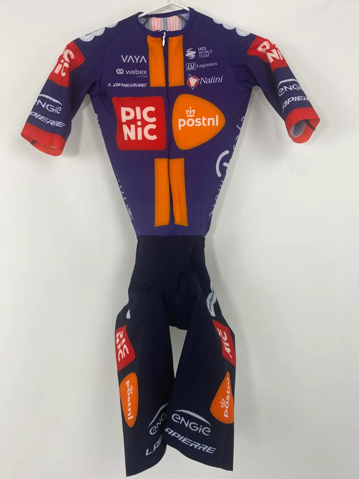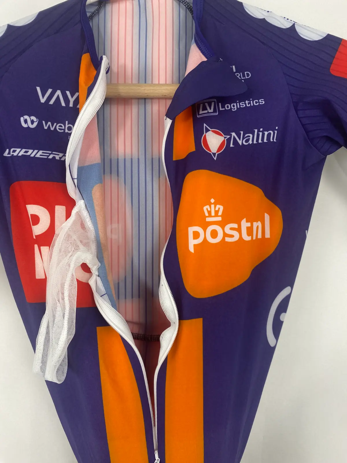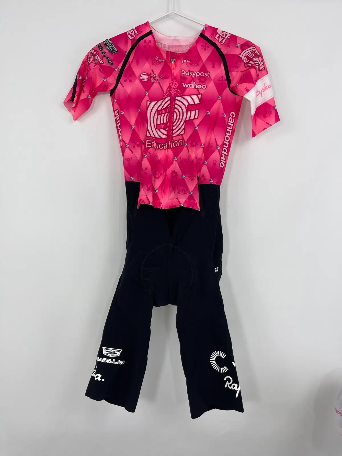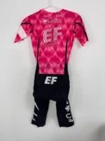 El Men Pro Team Ghost Suit de Rapha, diseñado para el equipo profesional Education First, es un traje aero de última generación que ofrece máxima aerodinámica, ligereza y ajuste ceñido. Fabricado con tejidos técnicos ultraligeros y resistentes, reduce la resistencia al viento para mejorar el rendimiento en contrarreloj y pruebas de velocidad. Su diseño exclusivo con los colores y logos del Education First combina tecnología avanzada y estilo profesional, siendo la opción perfecta para ciclistas que buscan velocidad y eficiencia al más alto nivel.