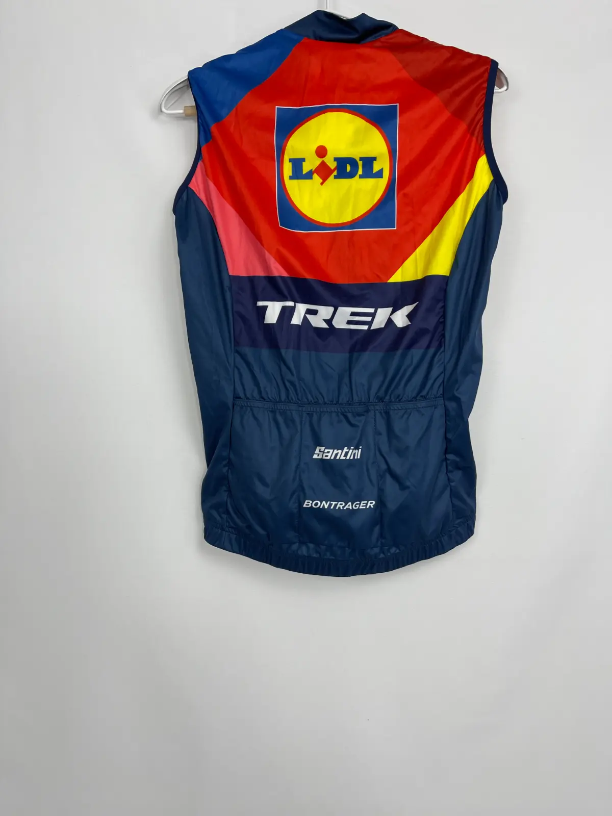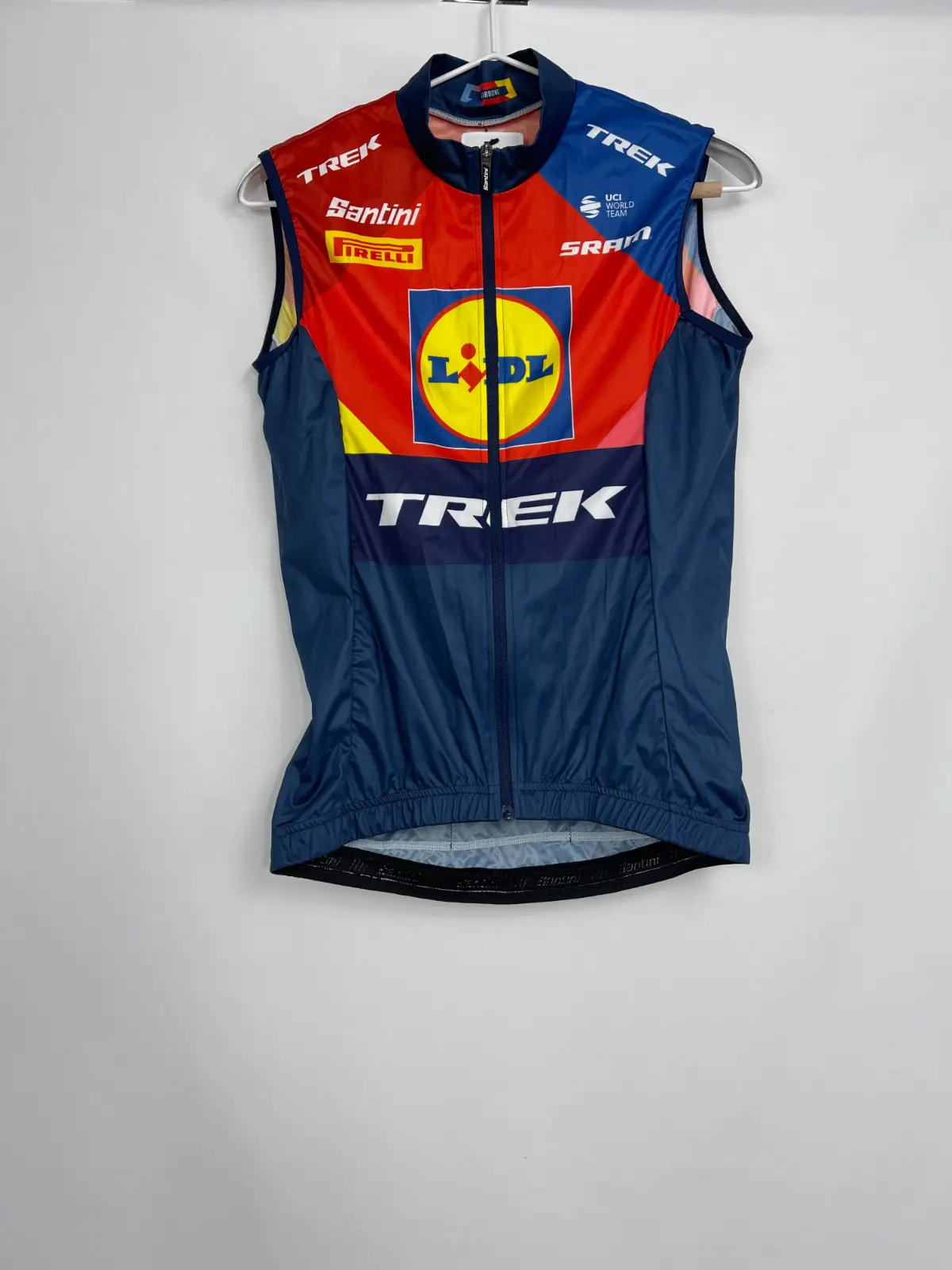 El chaleco cortavientos del equipo de ciclismo profesional Lidl-Trek de la marca Santini es una prenda ligera y funcional diseñada para ofrecer protección eficaz contra el viento sin añadir volumen. Con un ajuste entallado específico para ciclismo, cuello alto y cremallera frontal, proporciona comodidad y libertad de movimiento durante la ruta. Sus detalles reflectantes mejoran la visibilidad en condiciones de poca luz y su diseño oficial del equipo Lidl-Trek aporta un estilo profesional, ideal para salidas en días frescos o con cambios de temperatura.