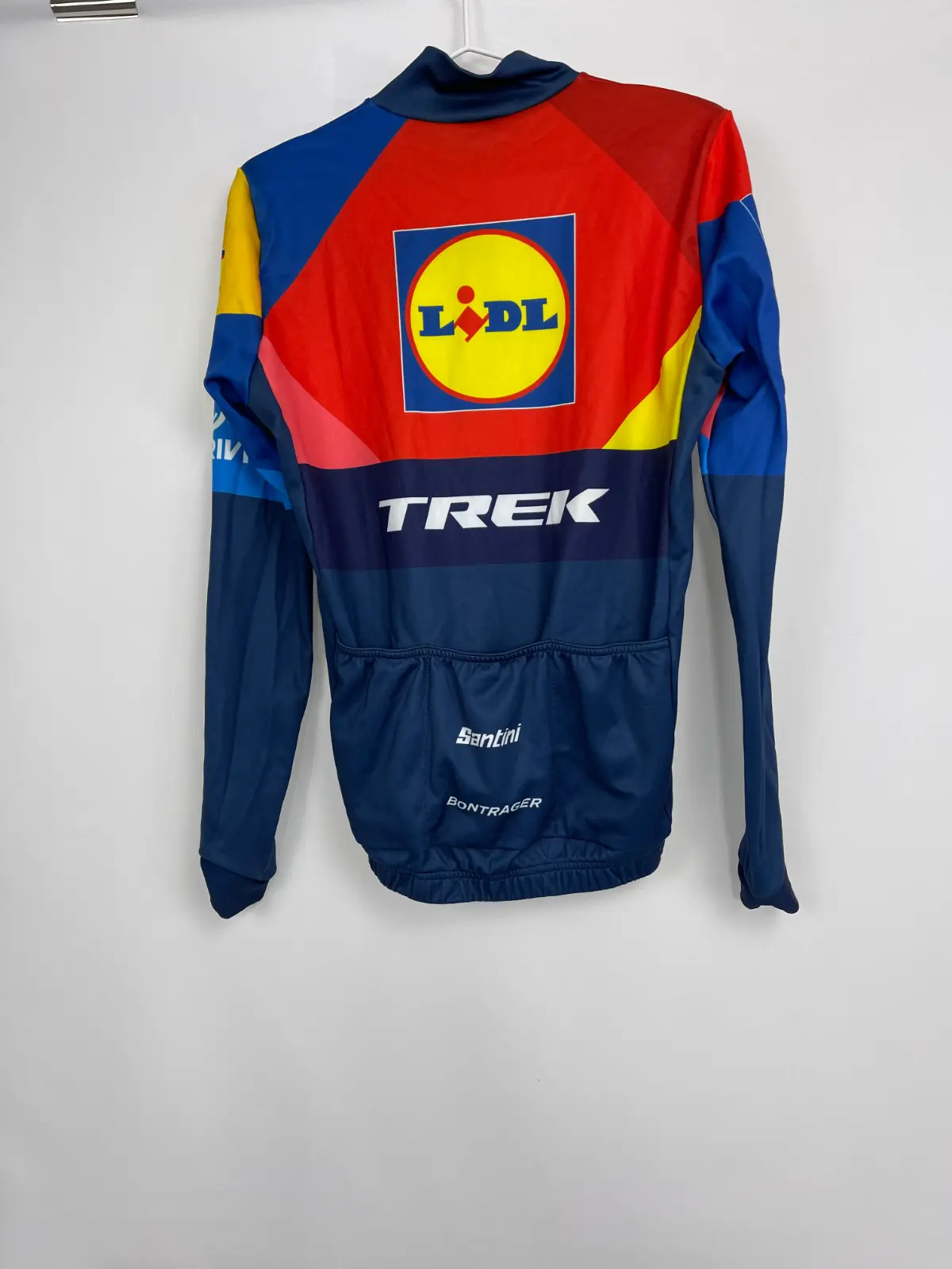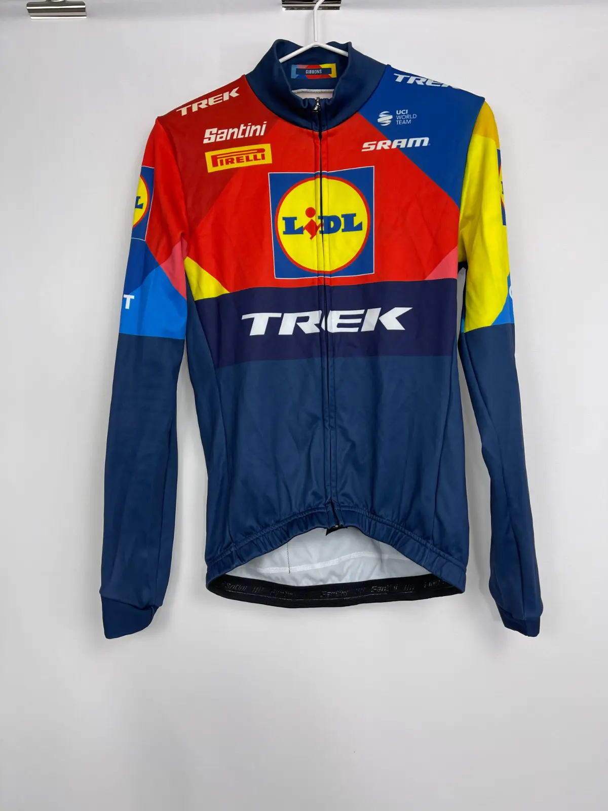 El maillot de manga larga del equipo de ciclismo profesional Lidl-Trek de la marca Santini es una prenda técnica pensada para ofrecer comodidad, rendimiento y protección en rutas frescas o variables. Con corte ergonómico específico para ciclismo y los colores y logos oficiales del equipo Lidl-Trek, este maillot combina estilo profesional con funcionalidad, proporcionando un ajuste ceñido y libertad de movimiento para entrenamientos y competiciones exigentes.