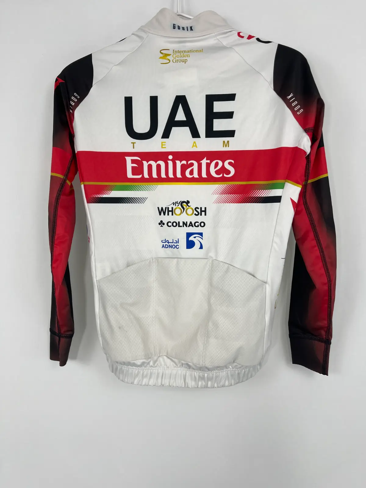 El maillot largo de invierno del equipo de ciclismo profesional UAE Team Emirates de Gobik está diseñado para ofrecer calor, confort y rendimiento en rutas con bajas temperaturas. Fabricado con tejidos térmicos, transpirables y resistentes al viento, mantiene el cuerpo seco y cálido durante entrenamientos y competiciones invernales.